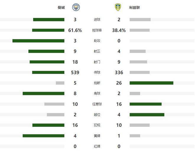 第25分钟曼城扩大领先优势,左侧角球开出后,造成利兹联门前一片混乱,格瓦迪奥尔乱战中破门得分,将比分改写为了2-0,加盟蓝月军团后,格瓦迪奥尔已经打进了10粒英超进球,同期联赛后卫排名第一,半场比赛结束之前,尼科和赖因德斯连续完成高质量的打门,但都被利兹联门将奋勇挡出。